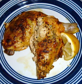 Quarter your chicken and loosen the skin with your fingers. Pull back the skin on all the pieces of chicken. Cut peeled garlic cloves into slivers. Arrange garlic slivers under the skin of chicken pieces. Sprinkle basil, oregano, sea salt, and pepper under skin of chicken pieces. Cover chicken with the skin. Salt and pepper all of the chicken again on top of skin. Cover tightly with foil in foil-lined pan. Roast in 350°F oven for 1 to 1 1/2 hours. Remove from oven, and remove foil. Squeeze lemon juice over chicken. Arrange the lemon quarters alongside the chicken pieces. Sprinkle liberally with paprika. Make a loose tent with the same foil you used to cover the chicken and place over chicken. Increase temperature to 400°F and roast until crispy and golden brown. Serve with Brown Rice Pilaf & Green Salad of your choice.