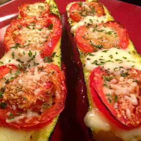 Cut the zucchini in half lengthwise. Scoop out the center where the seeds are with a spoon. Brush the surface with a mixture of crushed garlic, olive oil, salt, and pepper. Arrange sliced tomatoes into the grooves, sprinkle with bread crumbs and bake in a 350 degree oven for about 30 minutes. Remove and place diced or shredded mozzarella in between the tomatoes, place them back in, but now under the broiler til golden and bubbling. Remove and sprinkle with parsley (or basil or both)! You will love this as a side dish OR a meal! A serving is both halves of one zucchini.