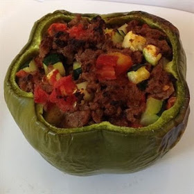 Preheat oven to 375ºF. Cut tops off peppers (don't throw them out!), and scoop out the seeds. Brown meat in large skillet. Add chopped onion and minced garlic and cook for 4 minutes. Add chopped zucchini and cook 3 minutes. Remove meat mixture from heat. Add tomatoes, spices, and egg and mix well. Place peppers in a glass baking dish. Spoon meat mixture evenly into peppers. Bake for 30-40 minutes until peppers are slightly browned. (Keep an eye on the peppers, as this can happen quickly.)
