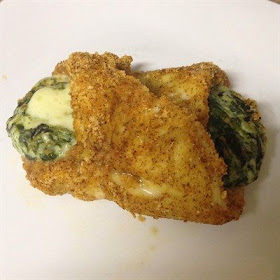 Preheat oven to 350°F. Wilt spinach in a big pan on the stovetop. Mix together pepper jack cheese, cooked spinach, and Greek yogurt. (If you just cooked the spinach, the cheese should melt nicely and make a delicious dip!) In a small bowl, combine almond flour and Cajun seasoning (see recipe below). Dip both sides of chicken breast in the mixture. Place a spoonful of the spinach dip in the middle of each chicken breast. Fold the ends up and use a toothpick to hold them in place. (Feel free to roll the finished product in the almond flour/Cajun seasoning mixture again at this time.) Bake for 18-22 minutes, until chicken is cooked through. Cajun Seasoning 2 1/2 teaspoons paprika 1 1/2 teaspoons chili powder 1/4 teaspoon cayenne pepper 1/4 teaspoon pepper 1/4 teaspoon oregano 1 teaspoon sea salt