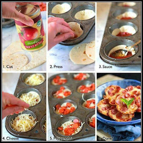 Preheat oven to 400ºF. Spray every other cup on a muffin tin with cooking spray. Cut out the tortilla. Place tortilla  into tins with all the pizza toppings. Bake for 12-15 mins or until cooked through and golden brown. Let cool for a few minutes and then use a knife to carefully extract each pizza. Enjoy!
